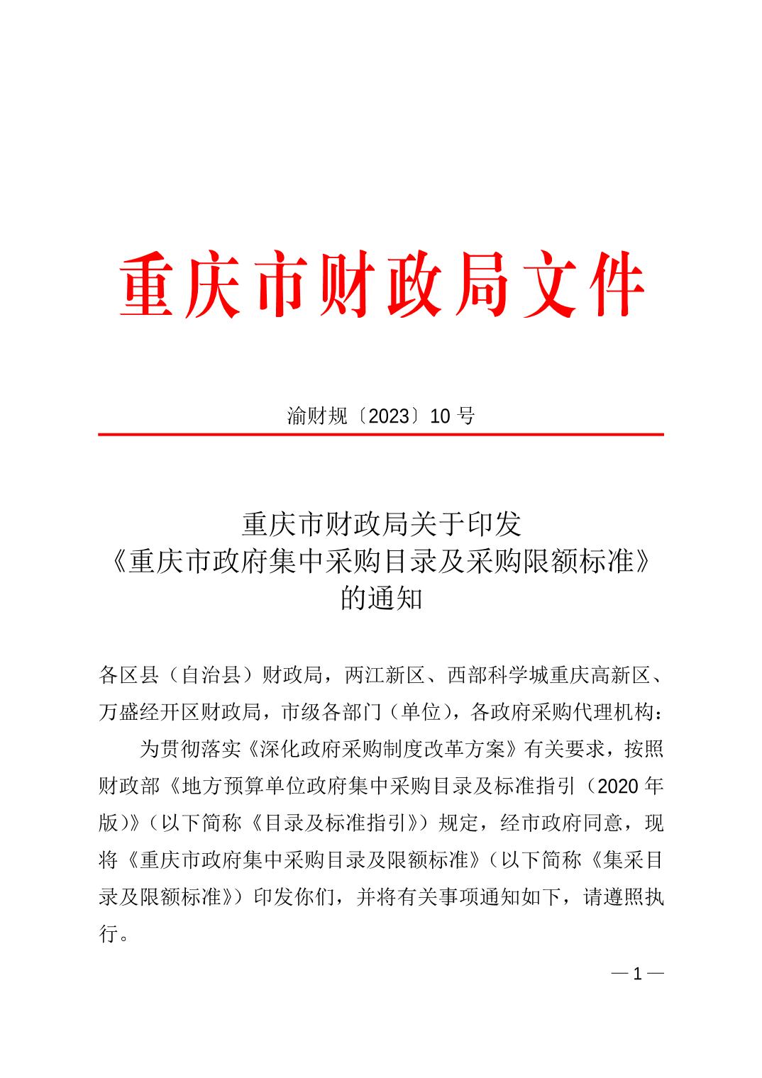 关于印发《重庆市政府集中采购目录及采购限额标准》的通知(以此为准)