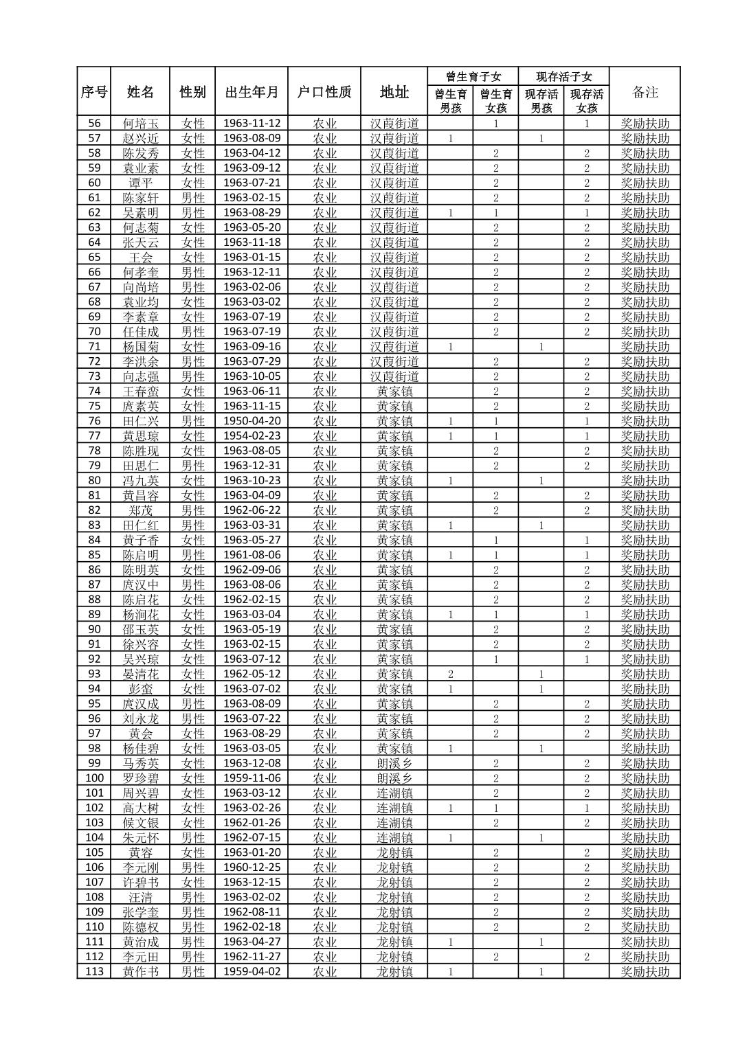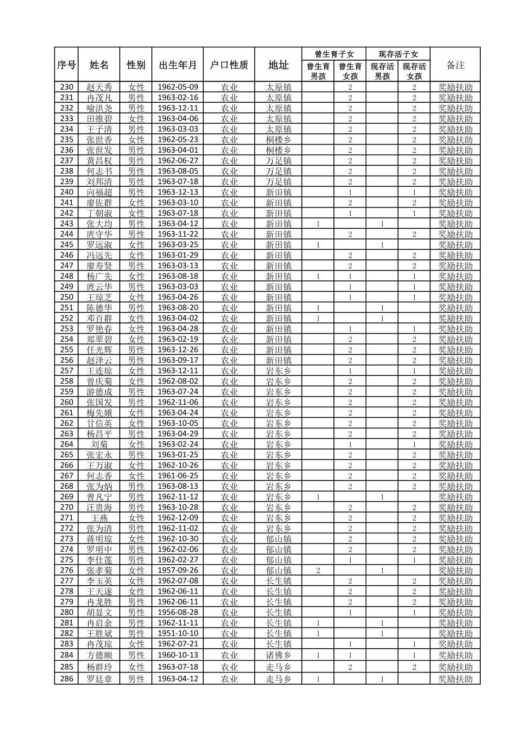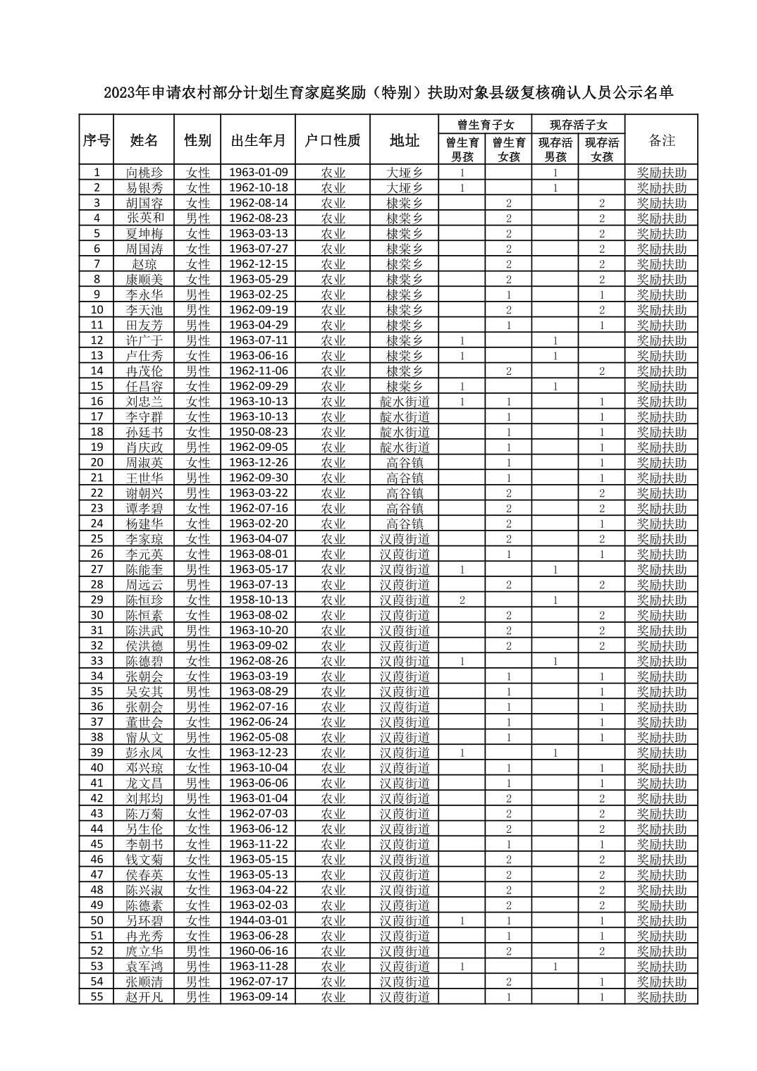 附:2023年申请农村部分计划生育家庭奖励(特别)扶助对象县级复核确认人员公示名单