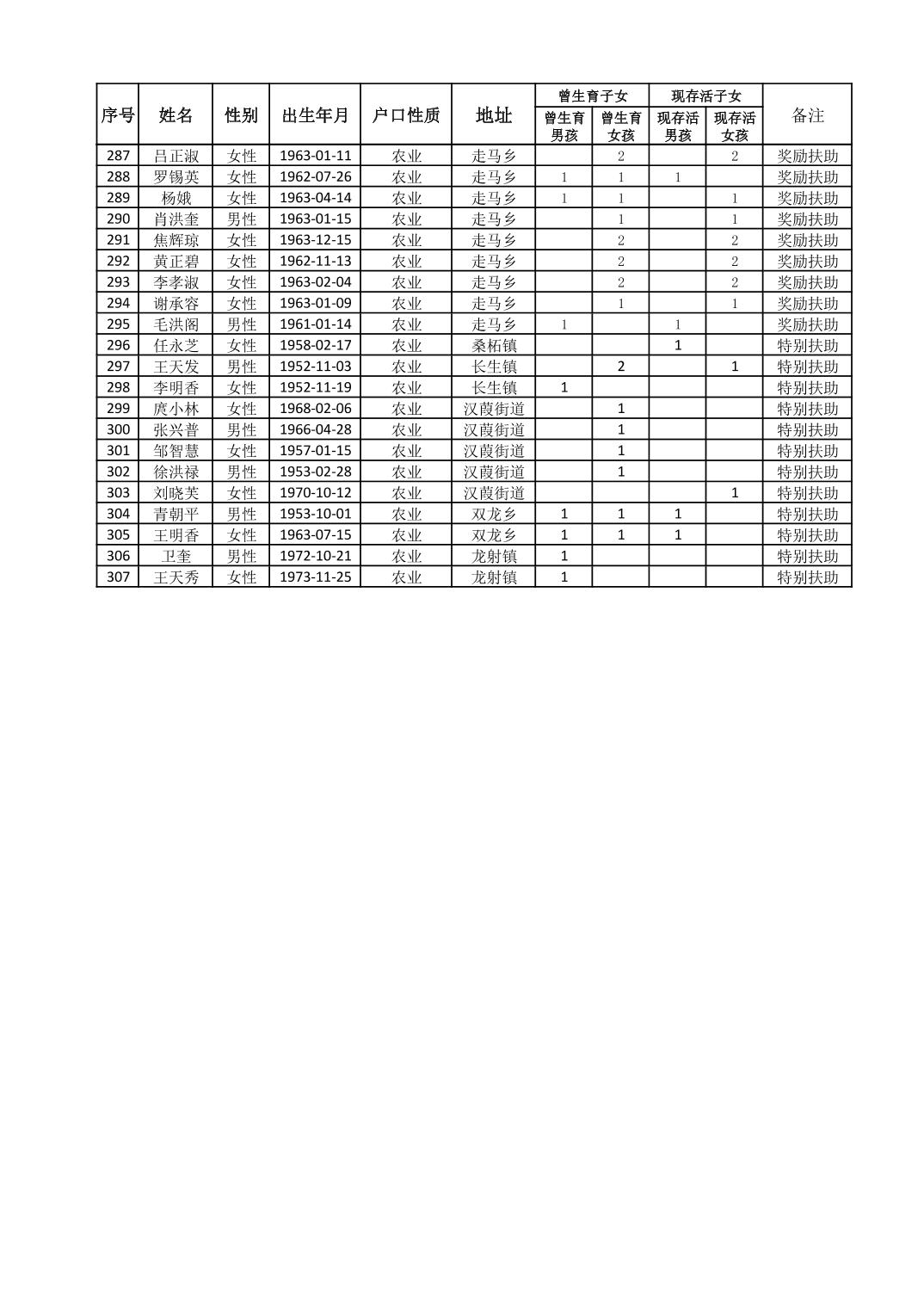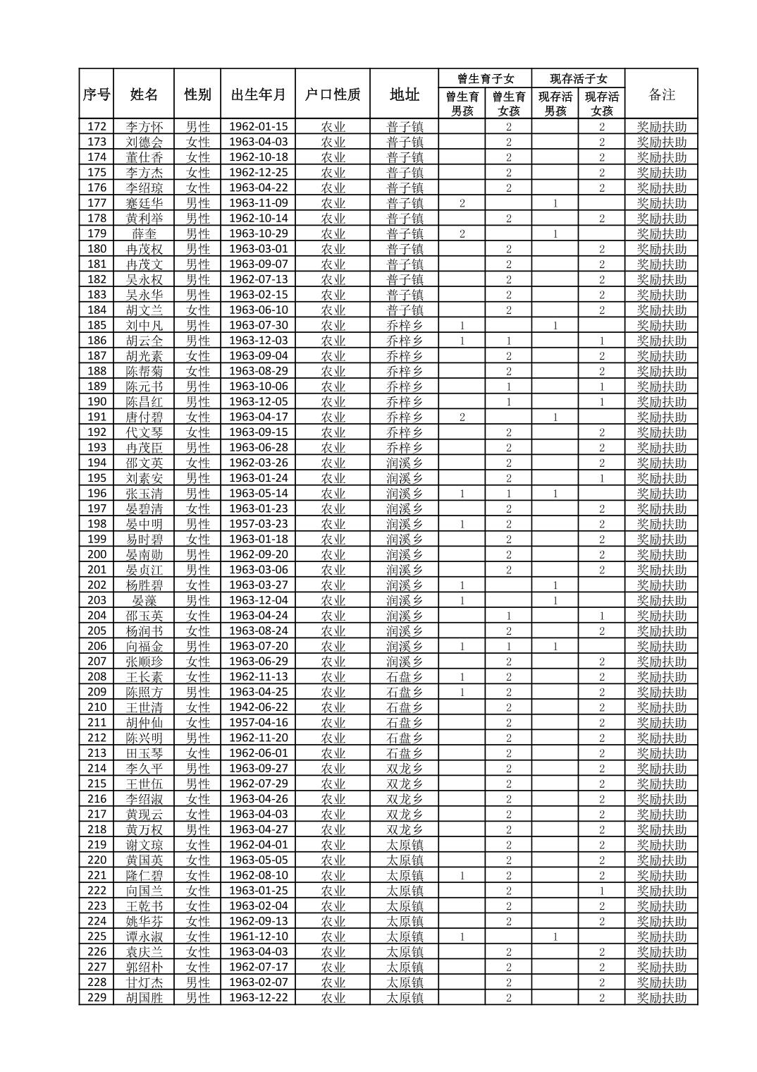以下人员向本村(居)委会提交了农村部分计划生育家庭奖励(特别)扶助申请,经村(居)委会评议、公示,乡镇人民政府(街道办事处)对资格初审、公示,县级审查确认,符合农村部分计划生育家庭奖励扶助条件,现予以公示。公示日期2023年2月16日至2023年2月25日。如发现公示对象基本情况不属实的,请如实反映。举报电话:78842515 ,78442257