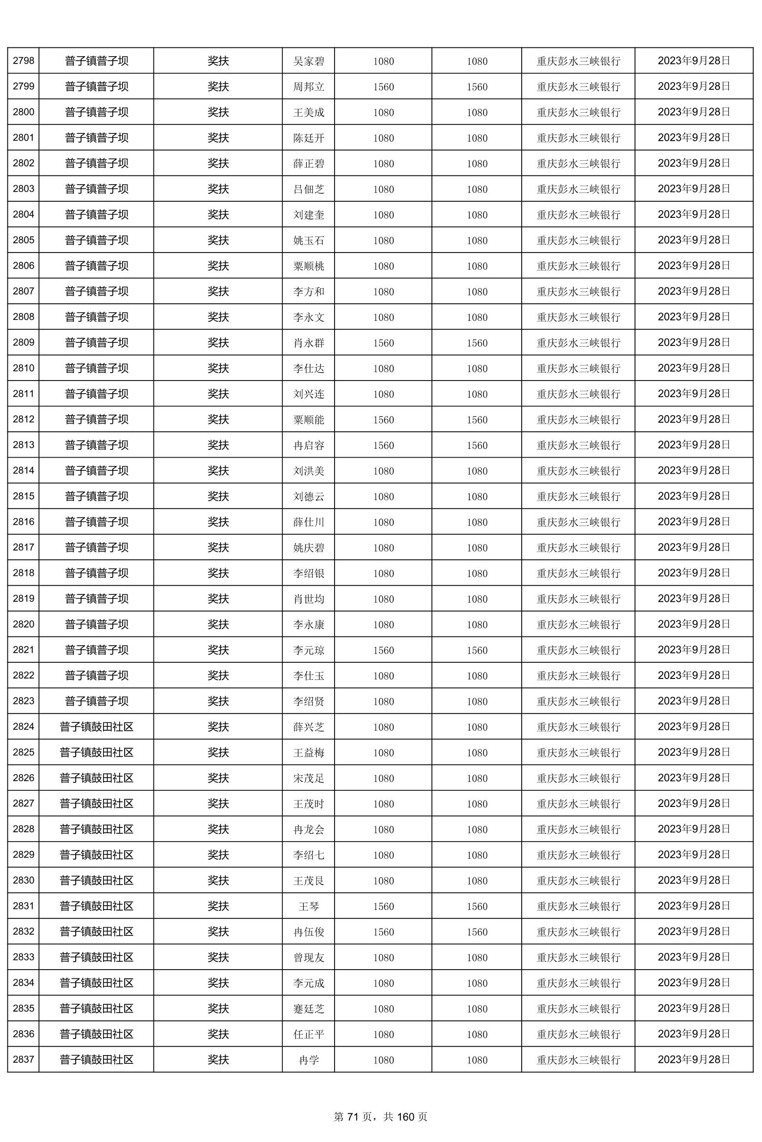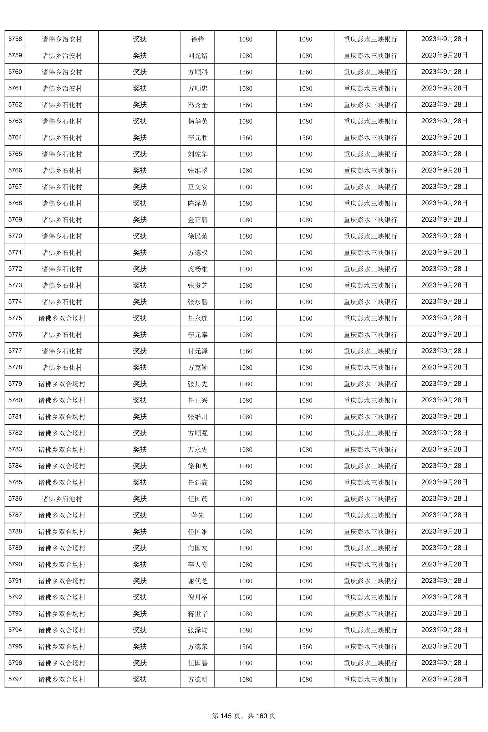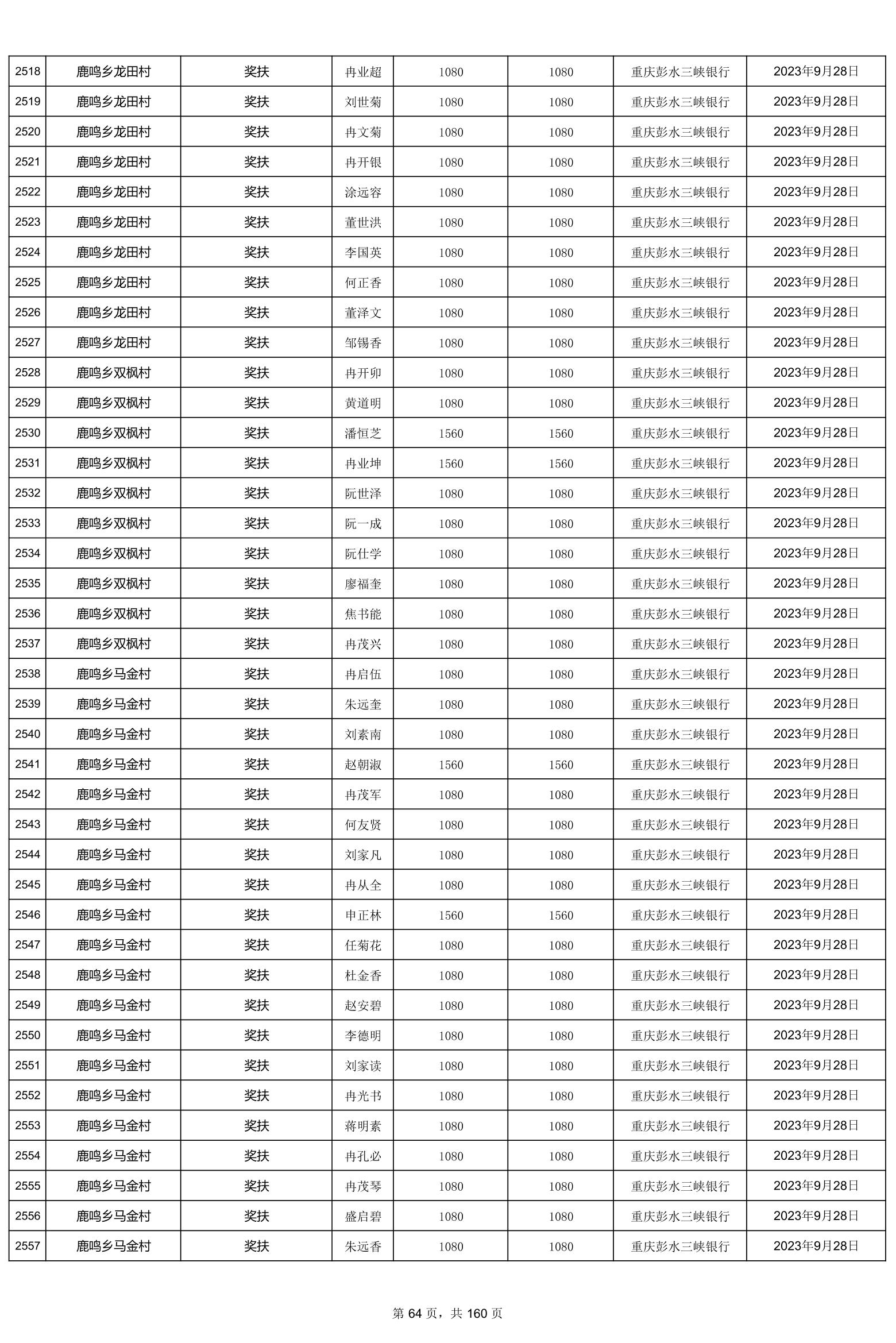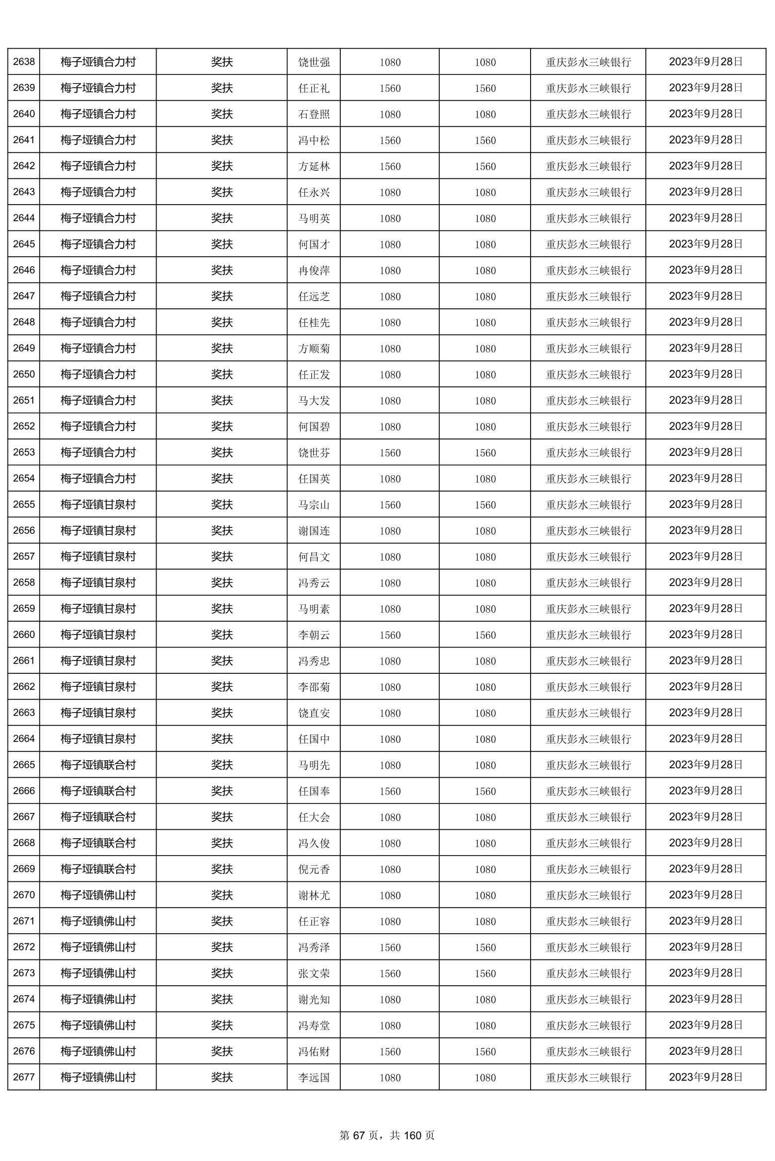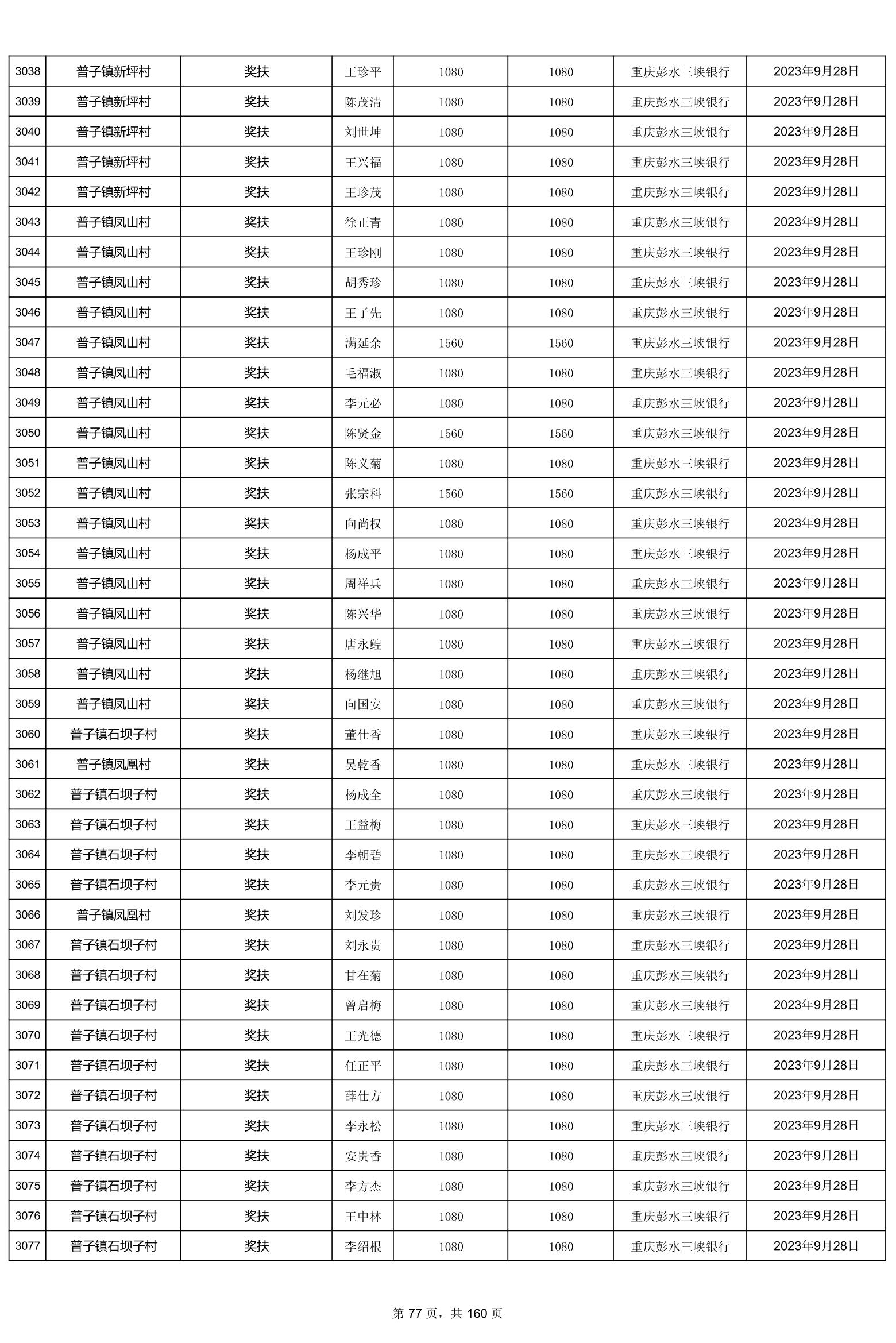 重庆市彭水自治县2023计划生育奖(特)扶扶助金发放明细公示