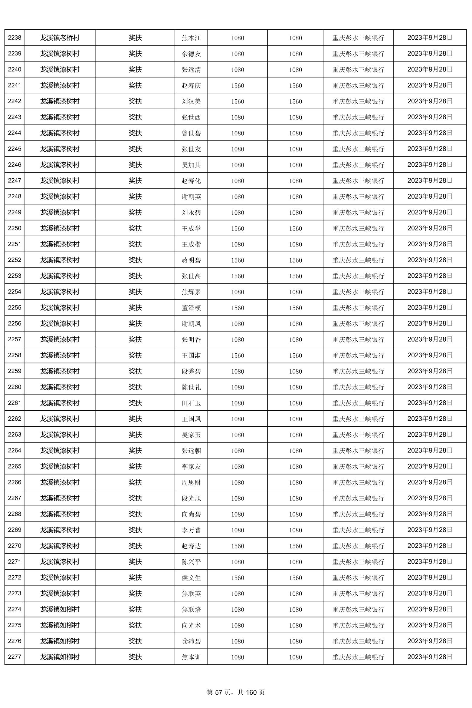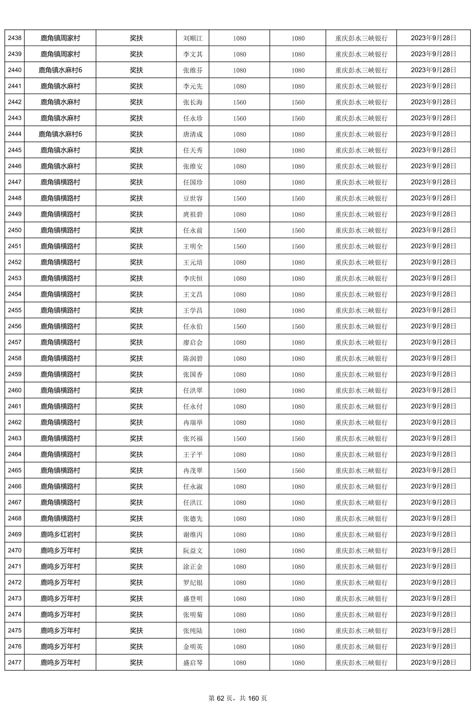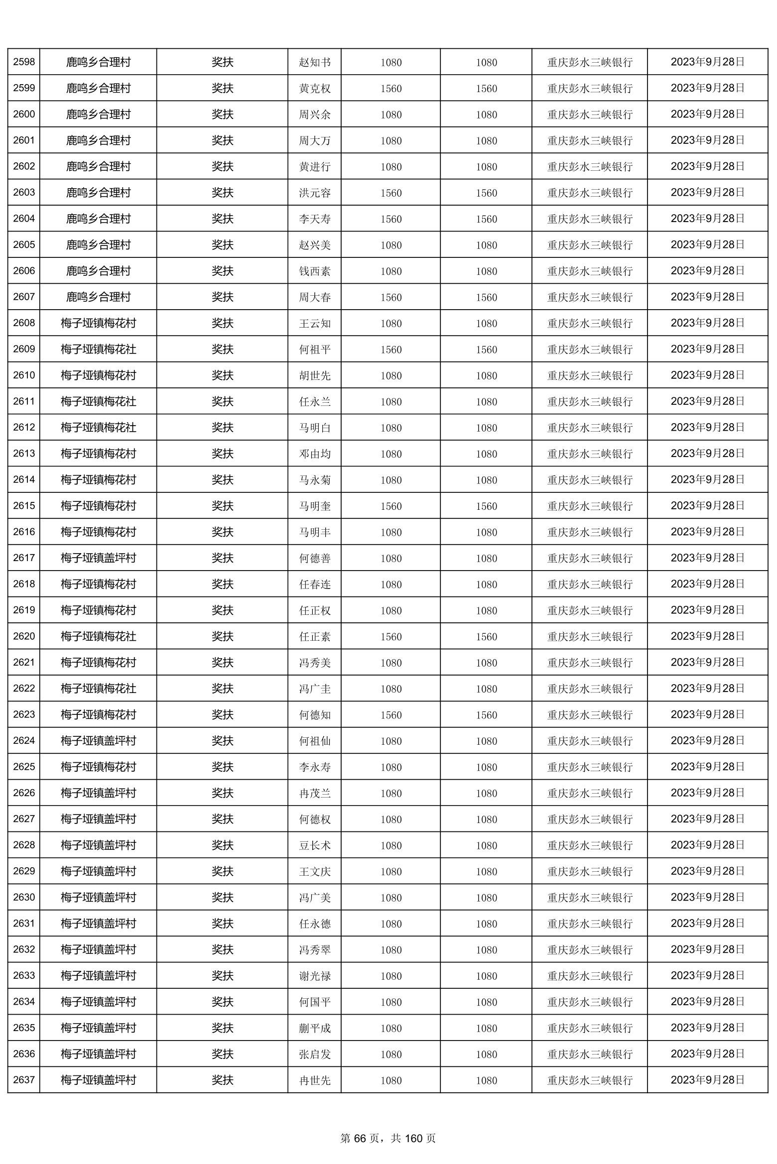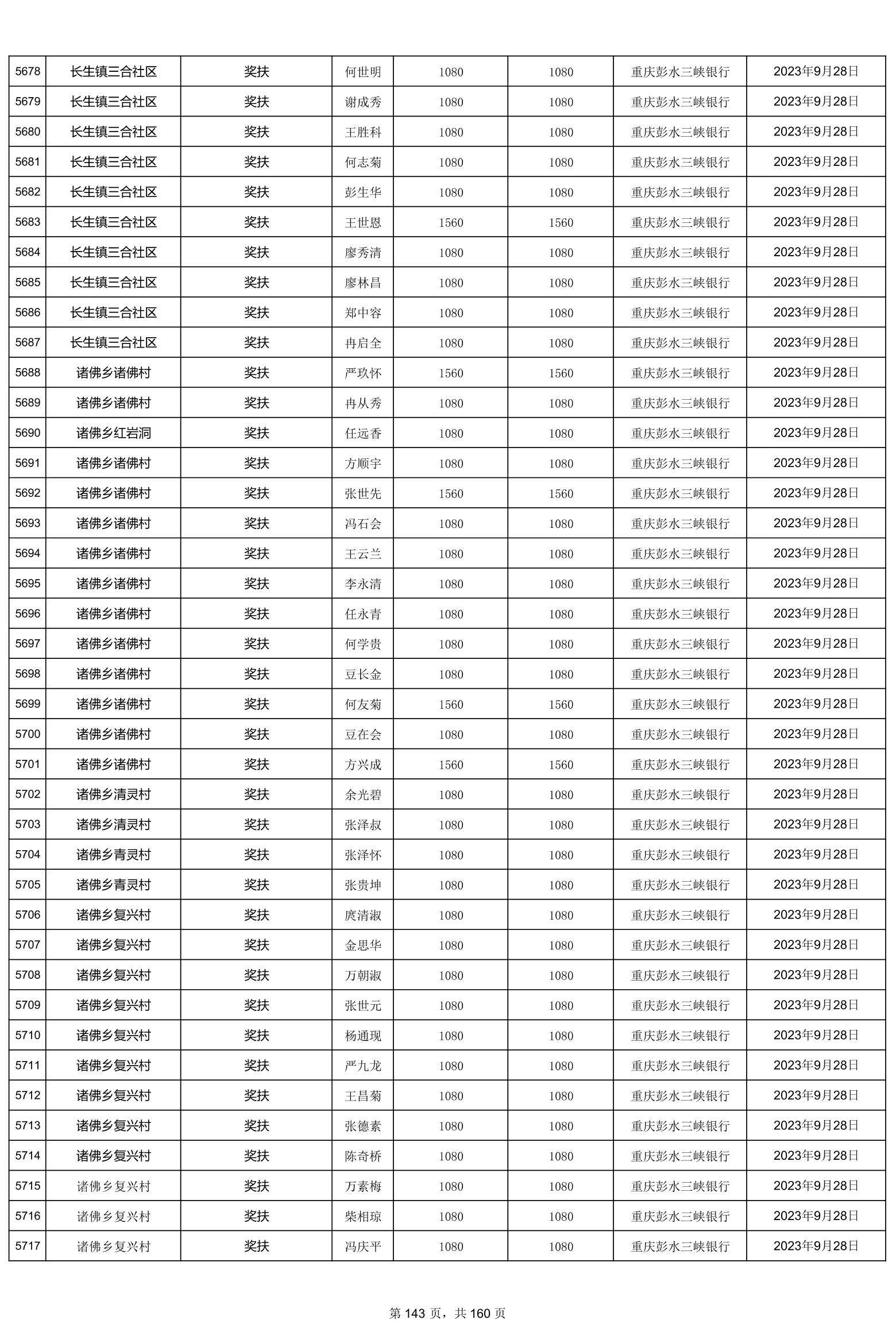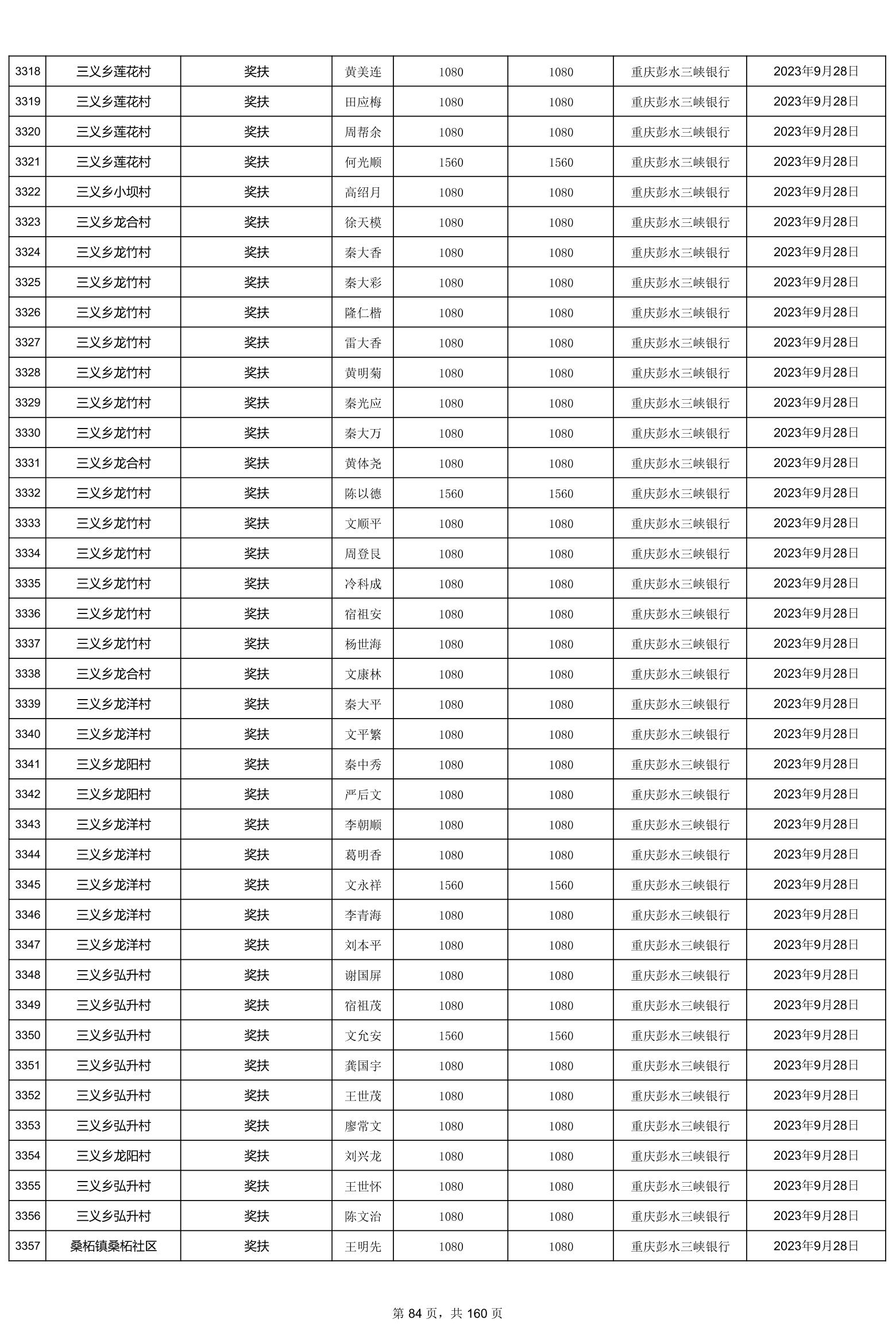 重庆市彭水自治县2023计划生育奖(特)扶扶助金发放明细公示