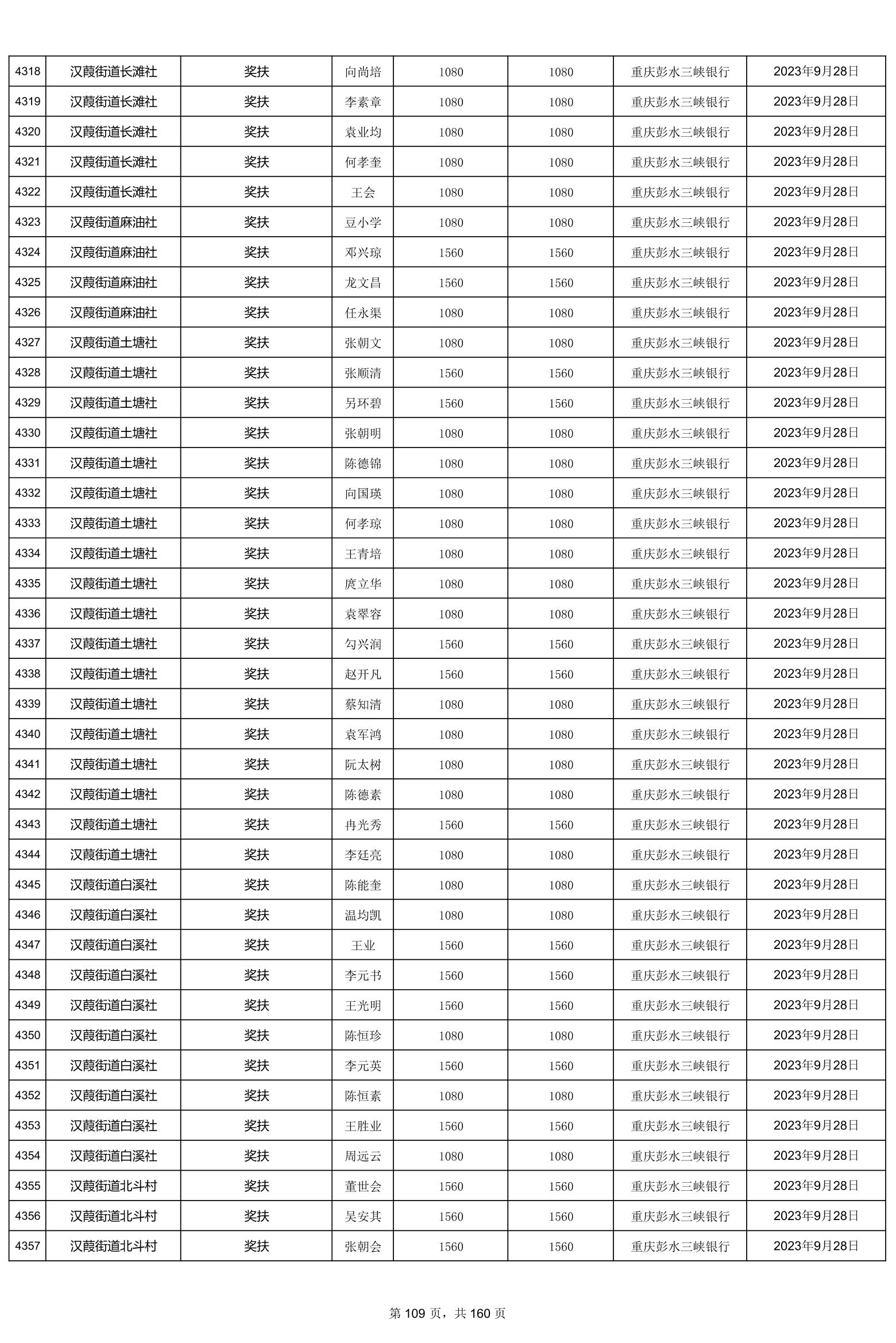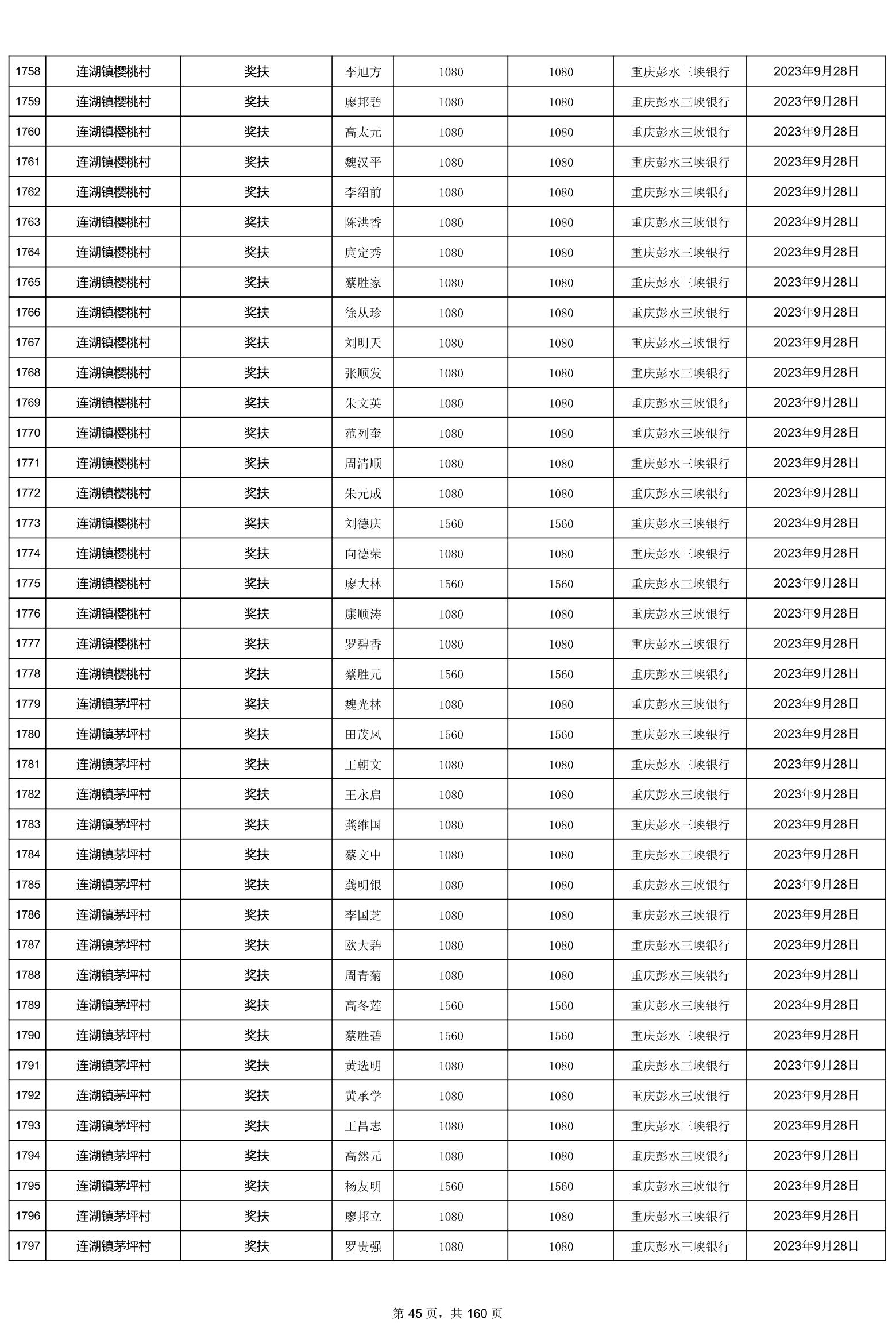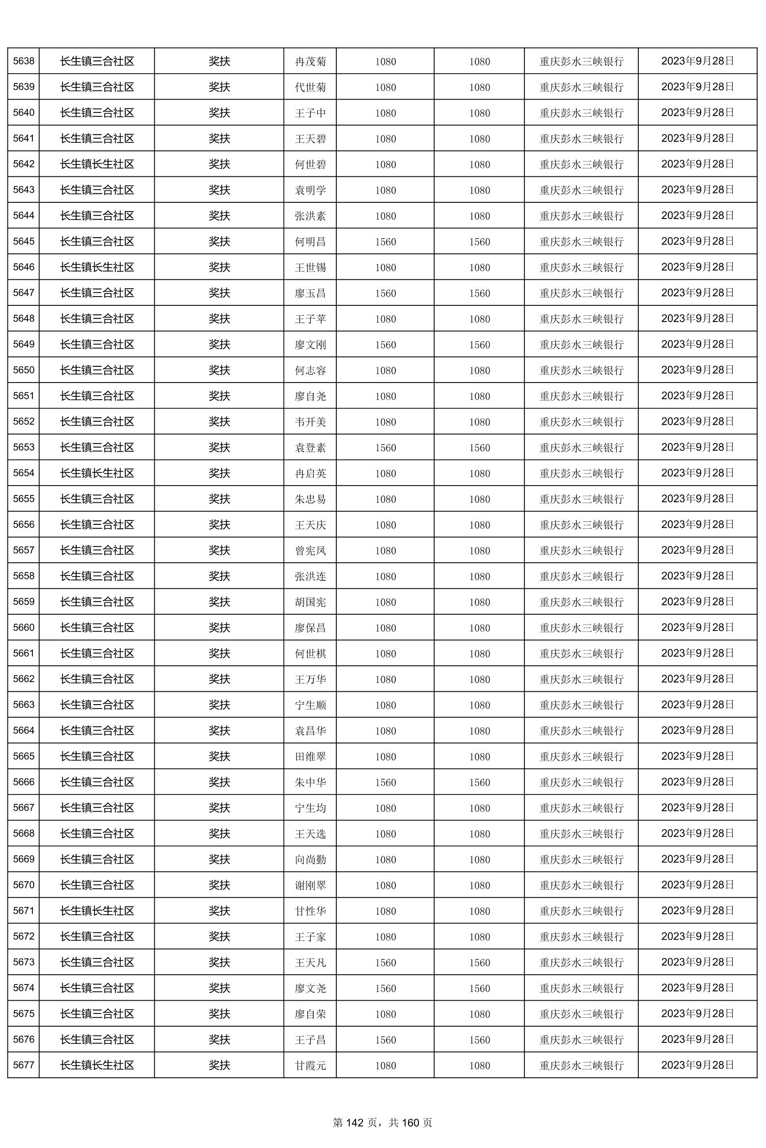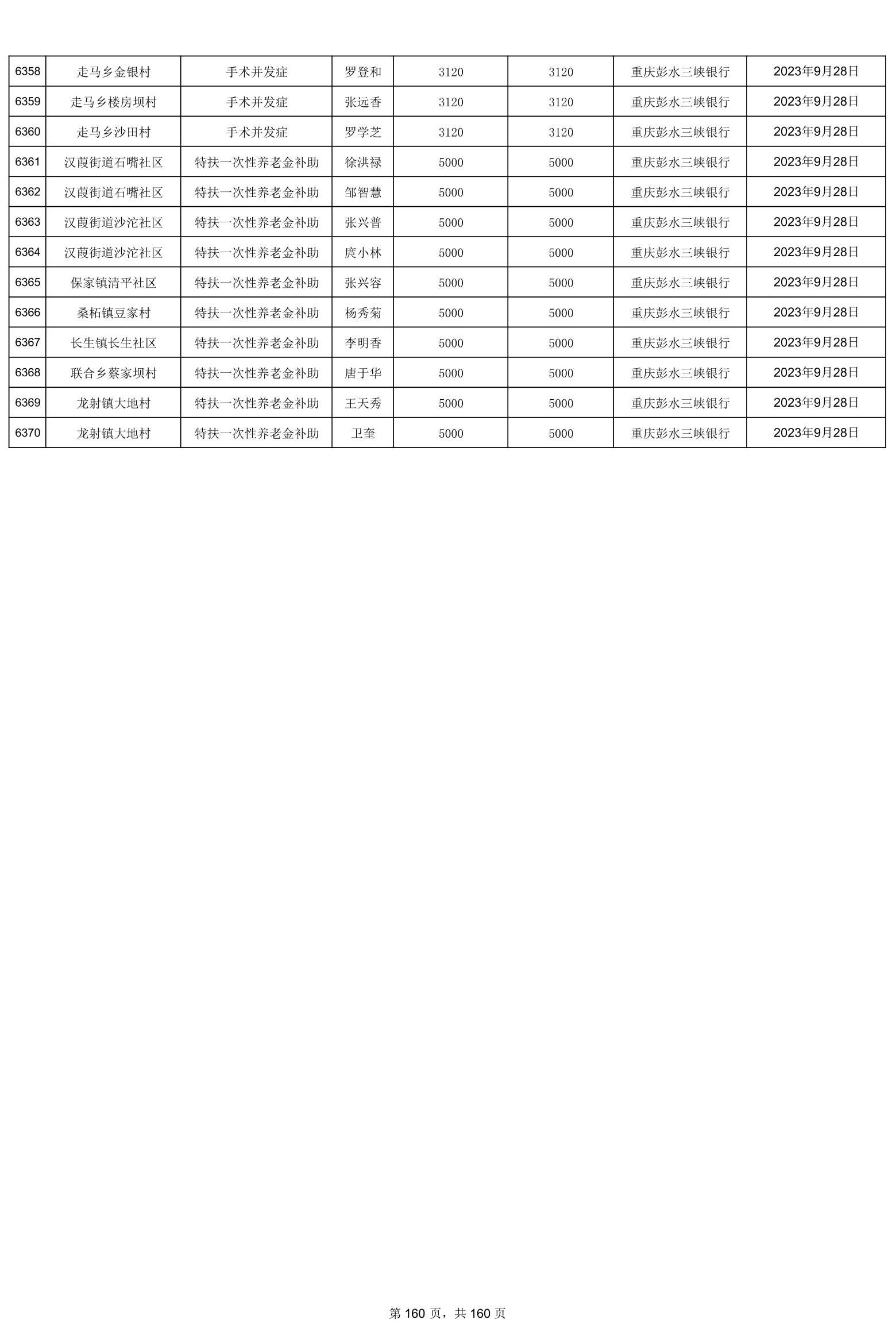 重庆市彭水自治县2023计划生育奖(特)扶扶助金发放明细公示