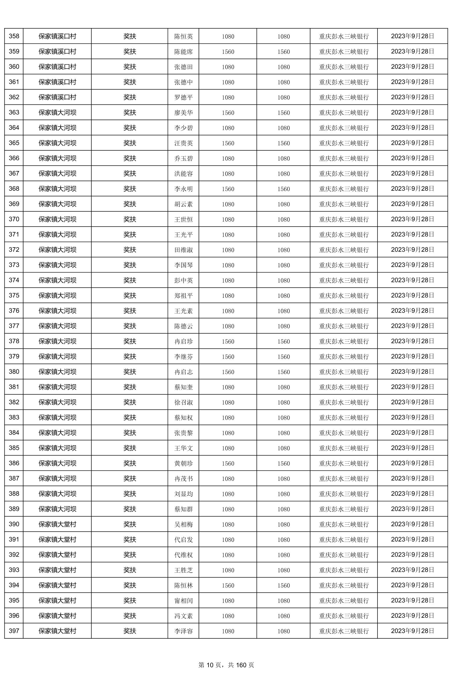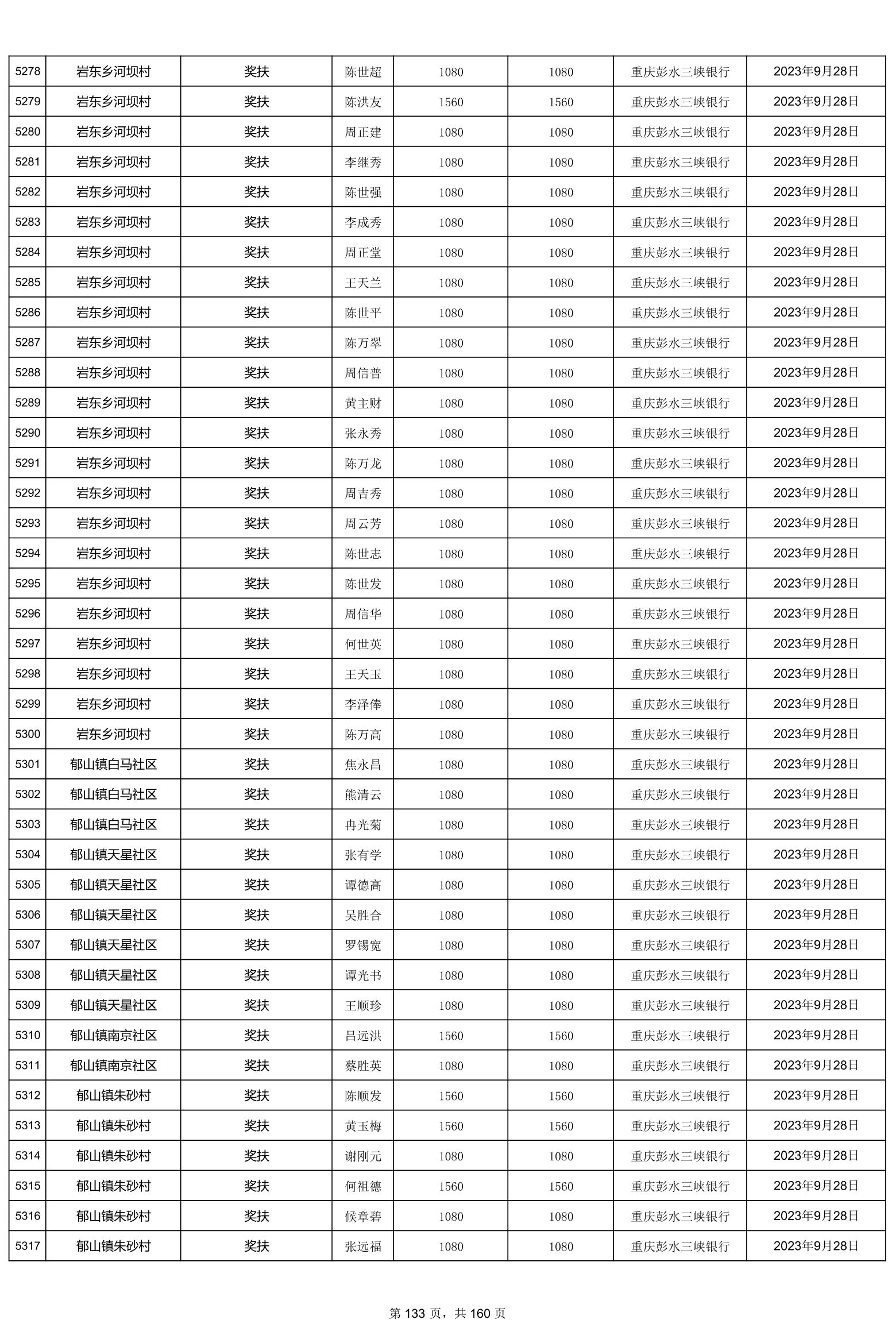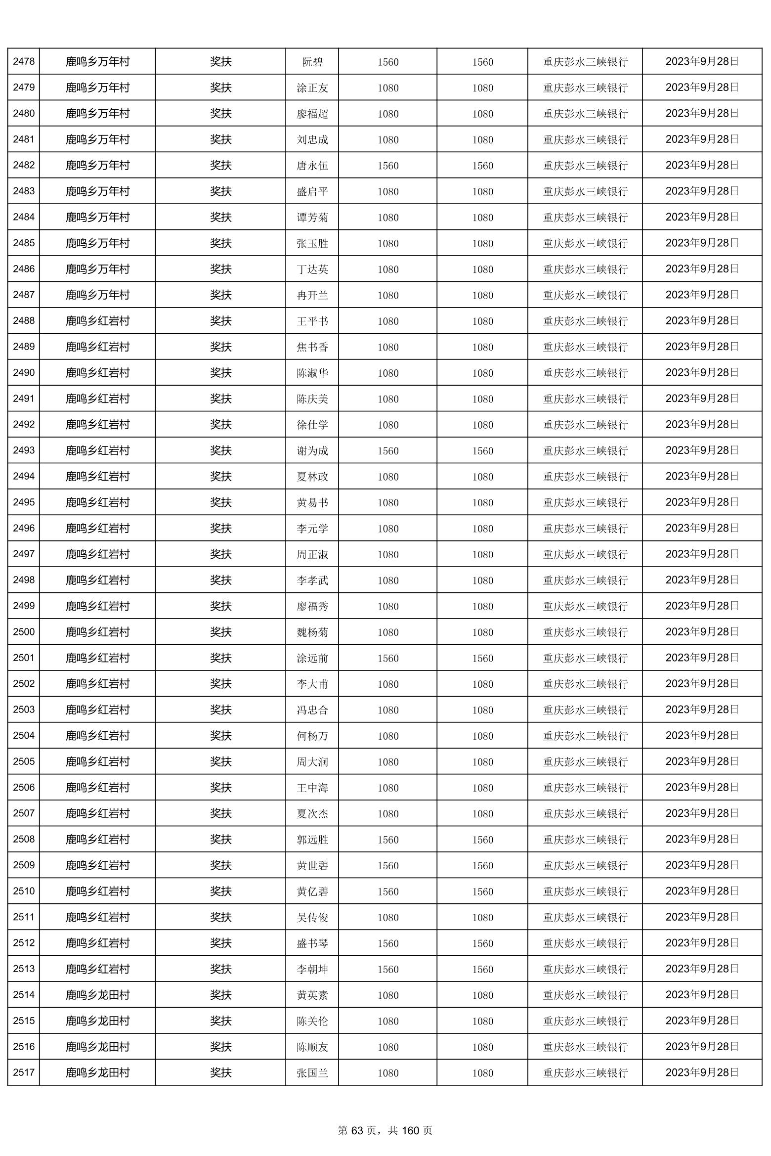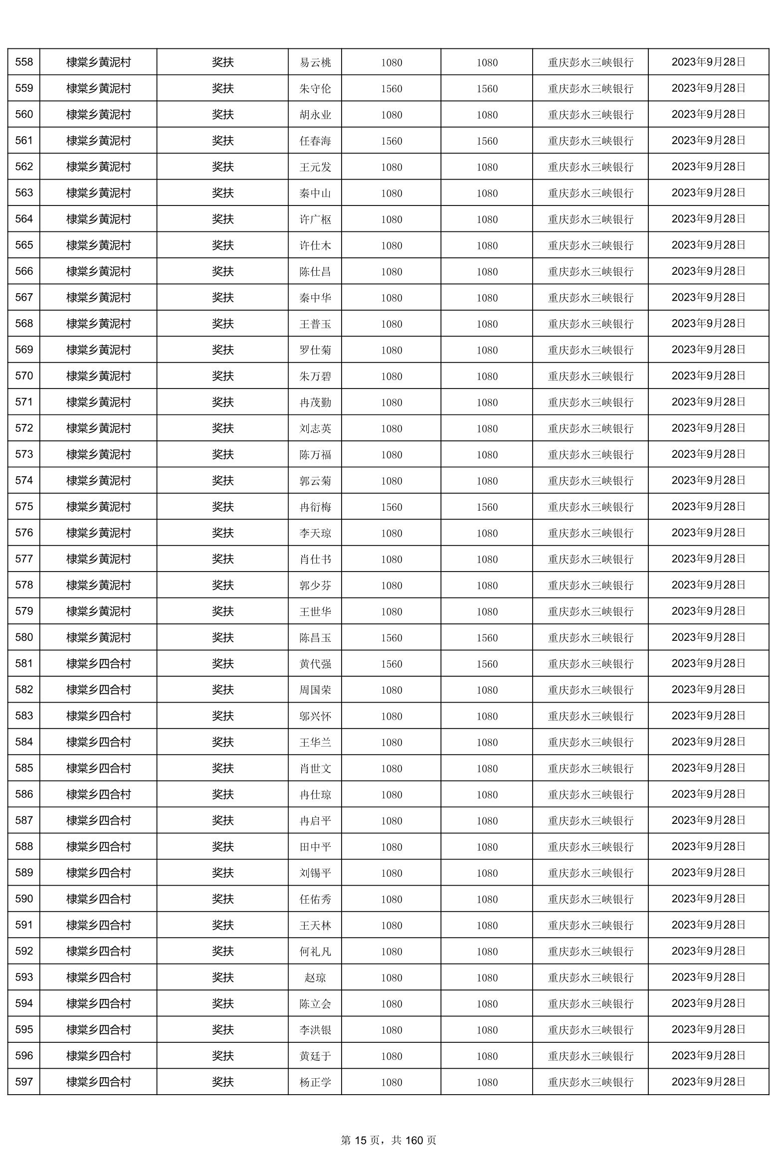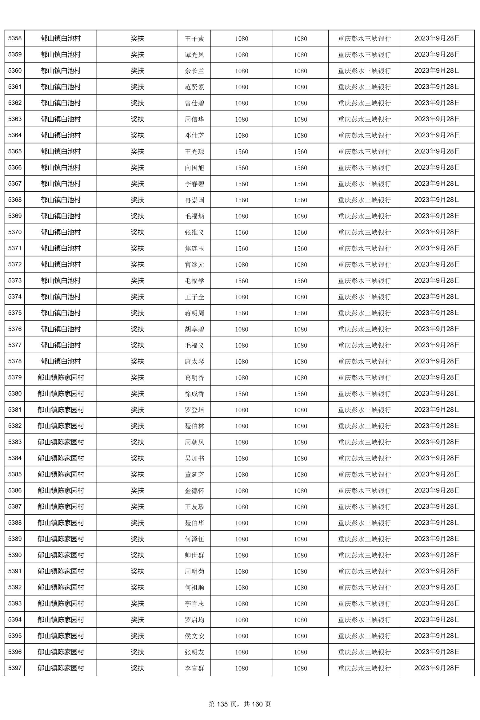 重庆市彭水自治县2023计划生育奖(特)扶扶助金发放明细公示