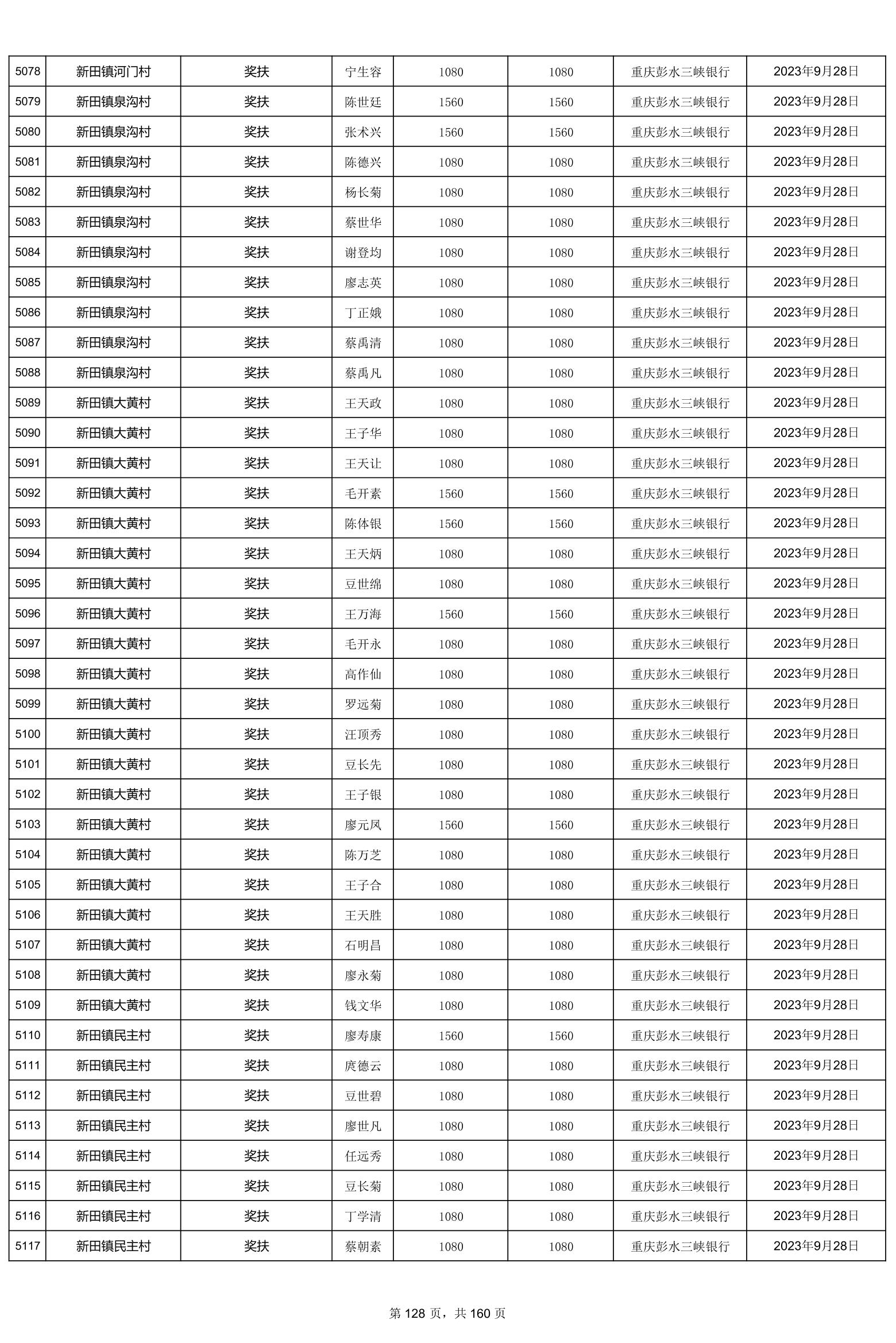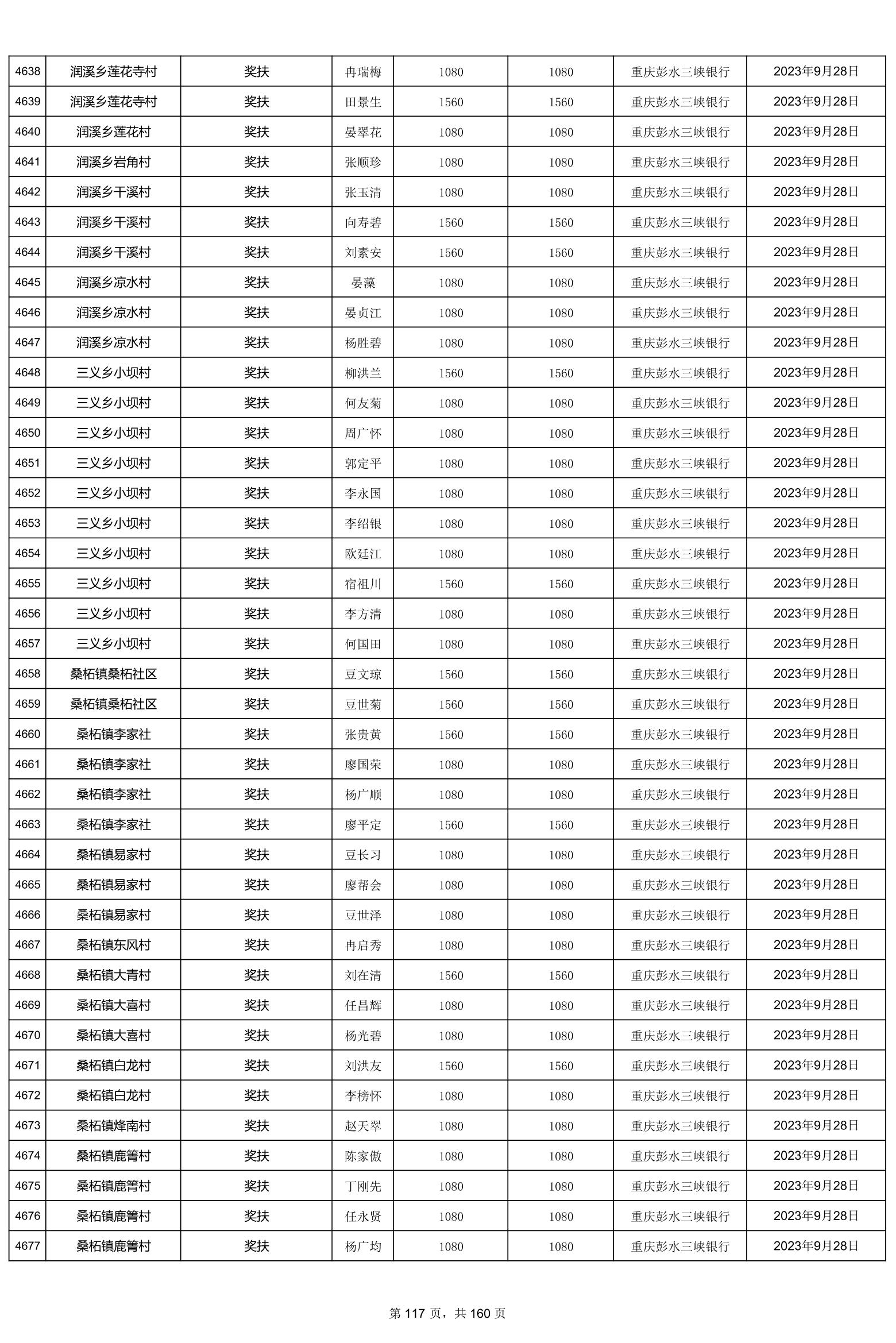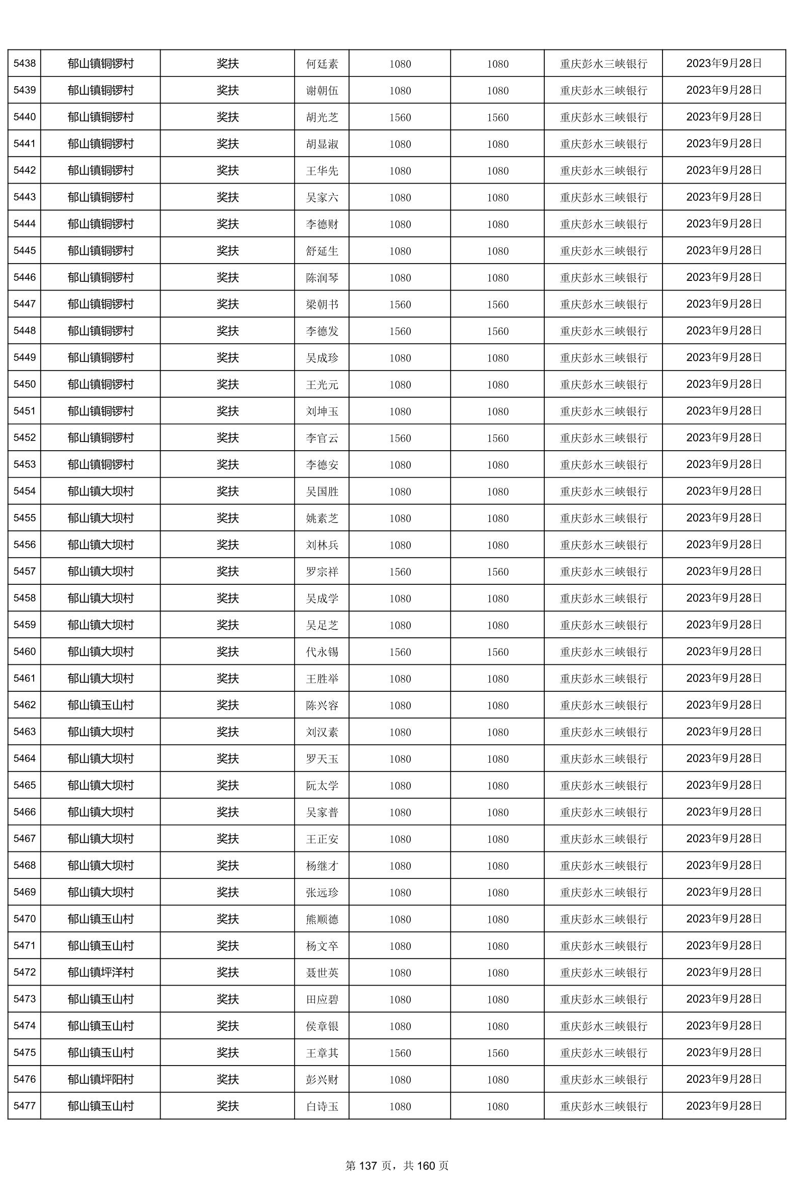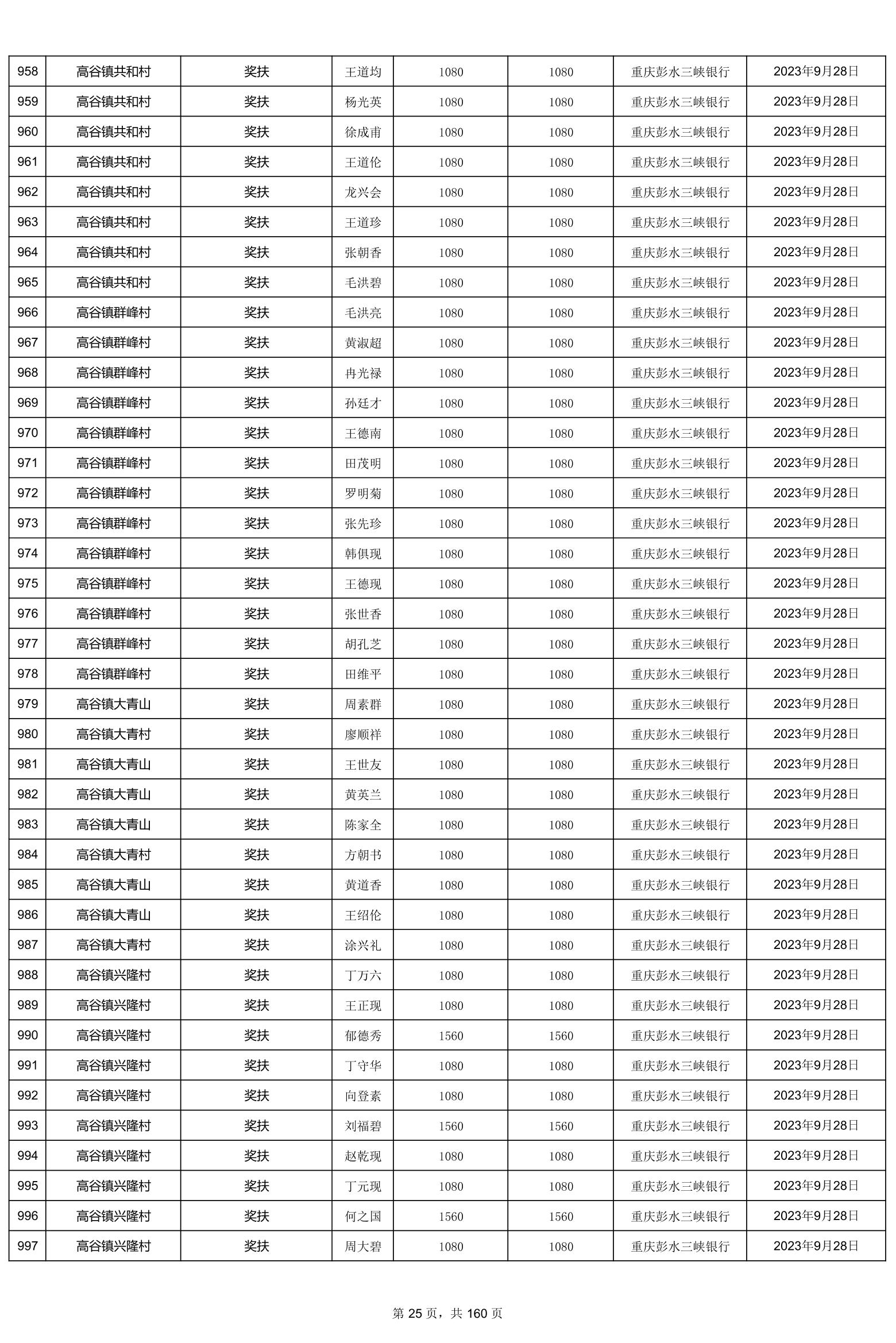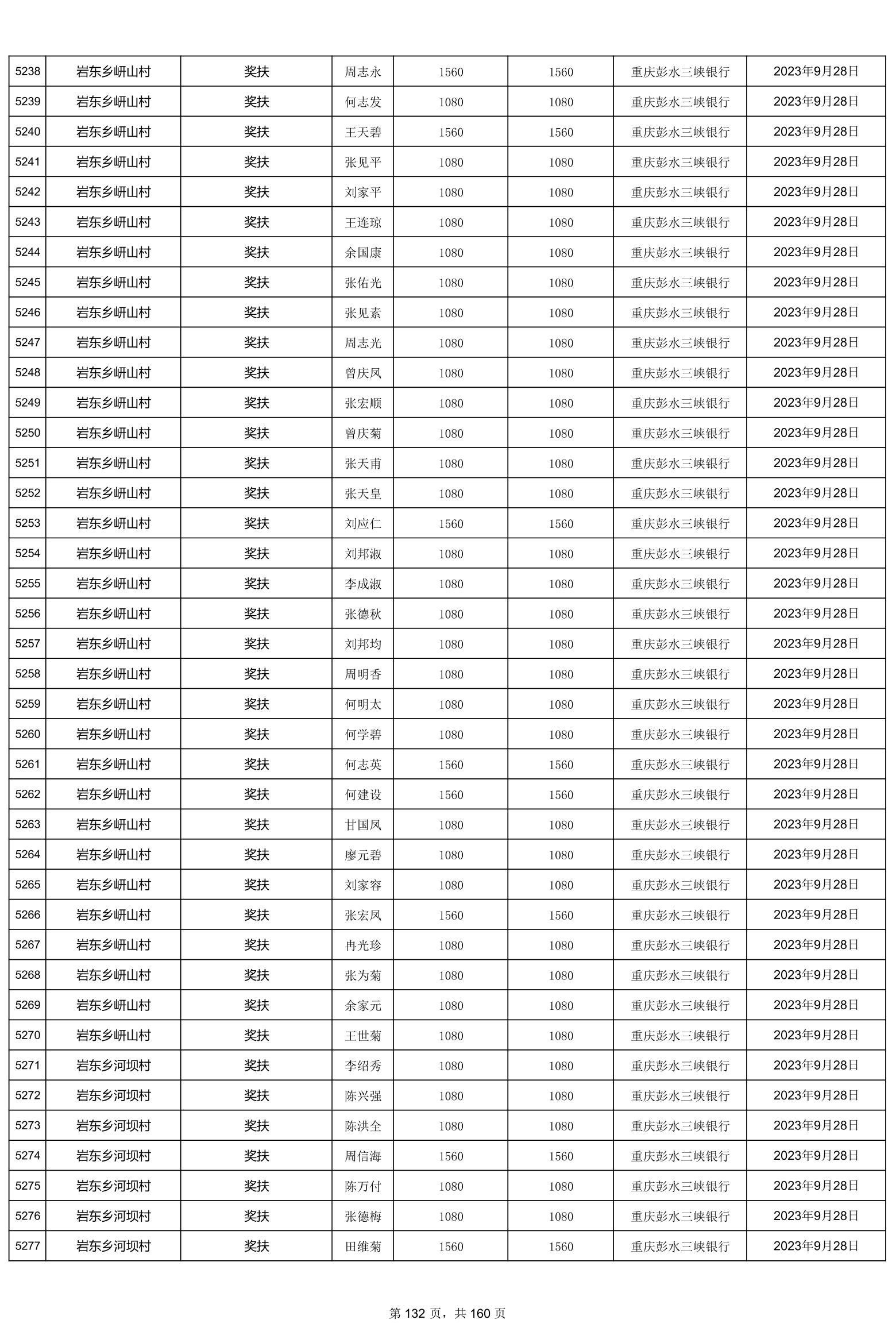 重庆市彭水自治县2023计划生育奖(特)扶扶助金发放明细公示