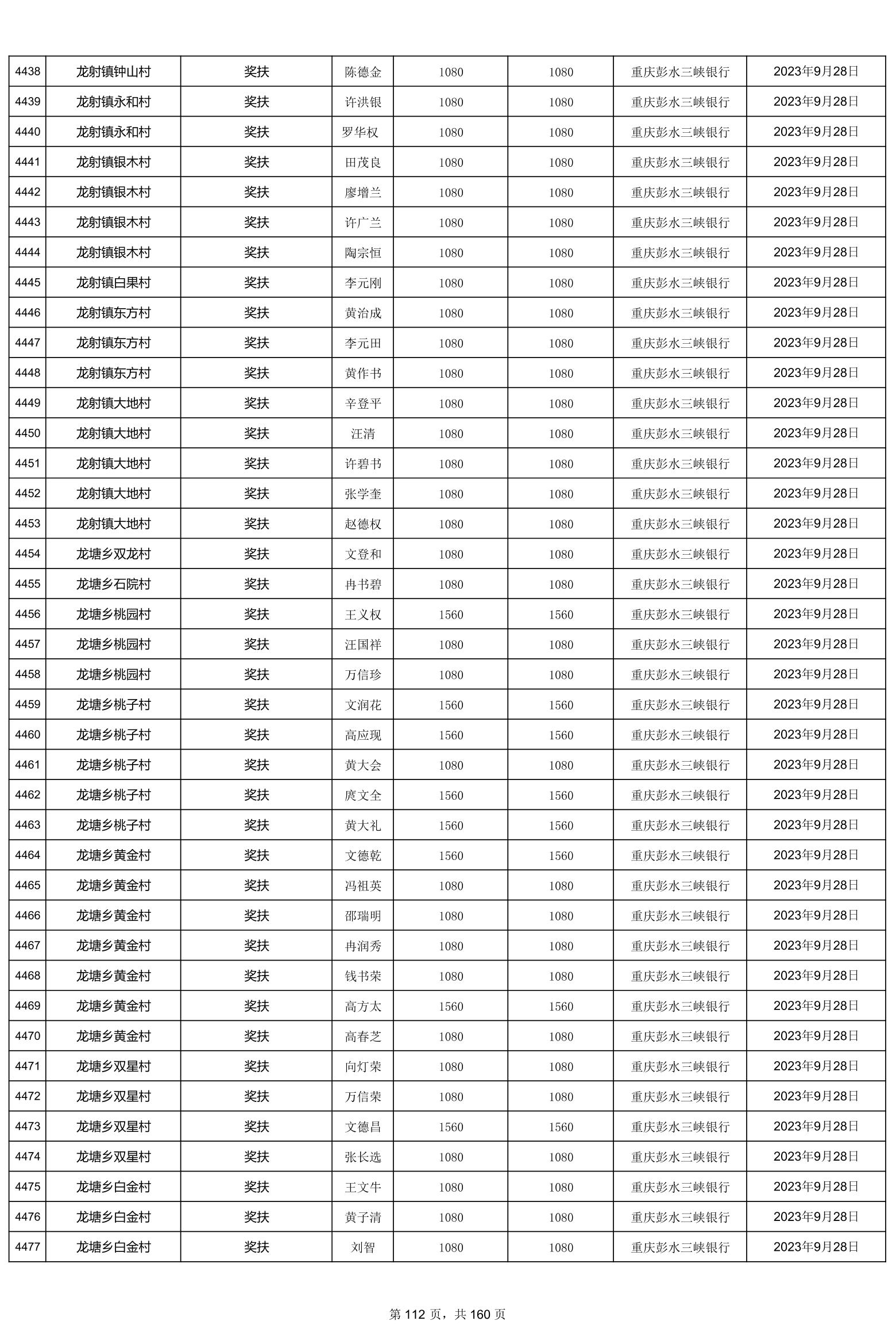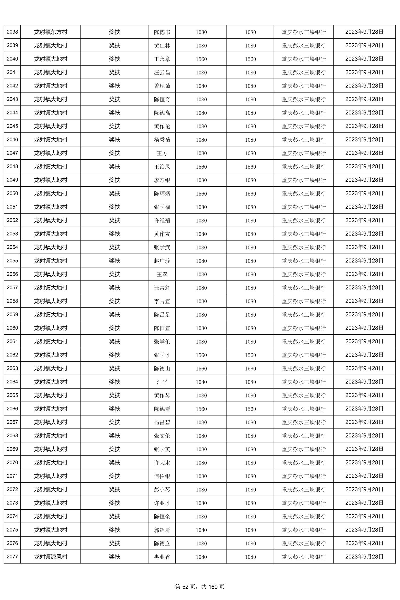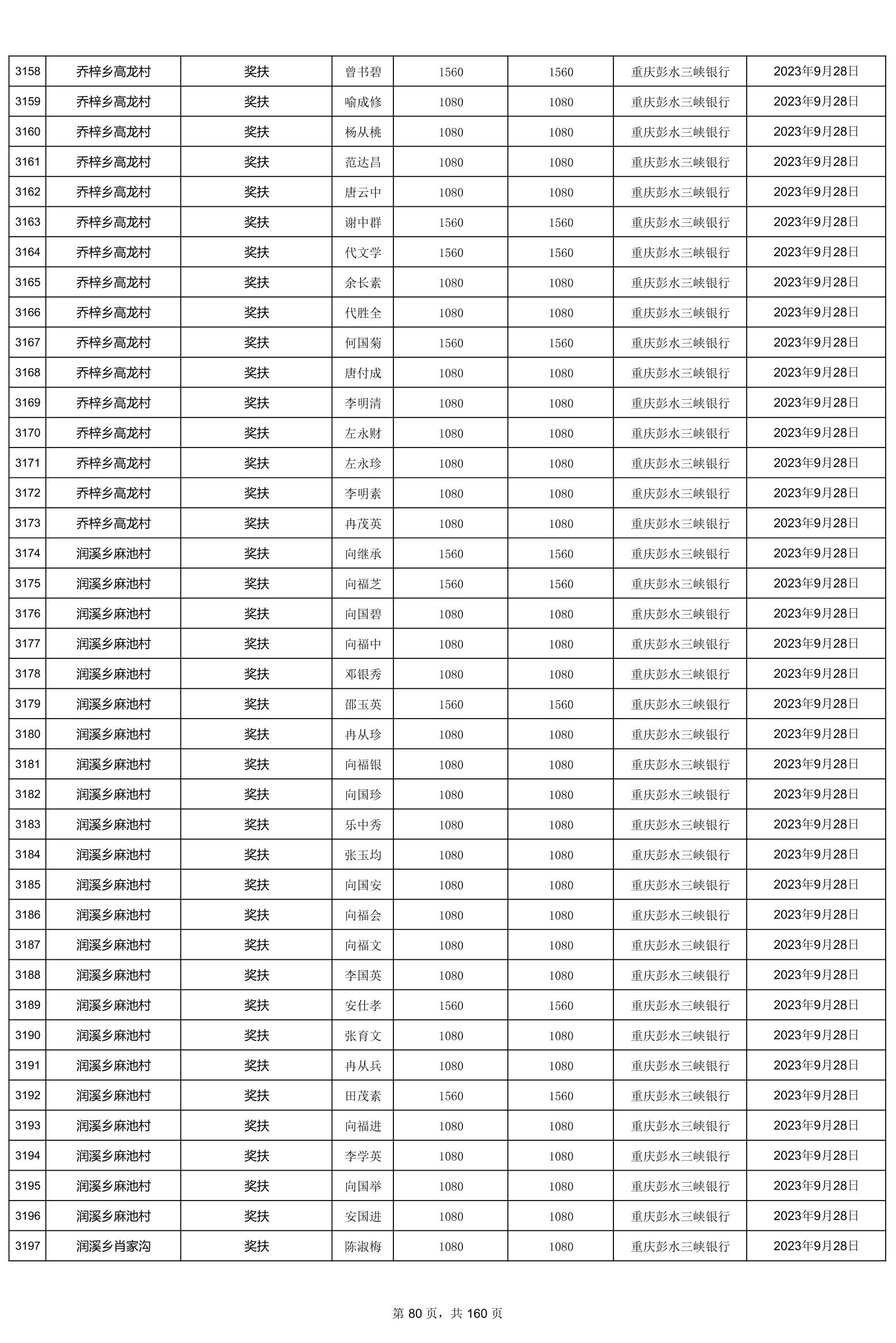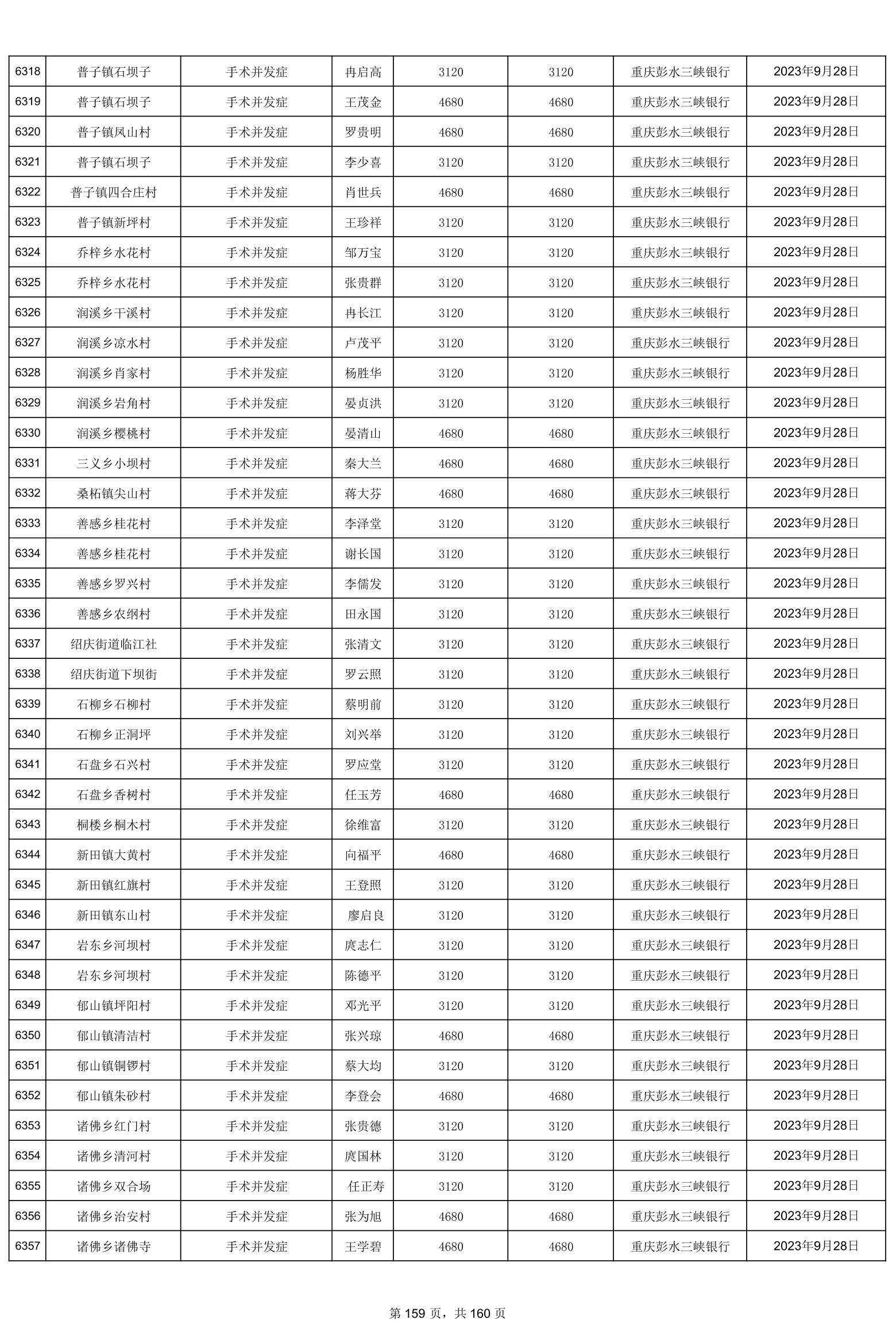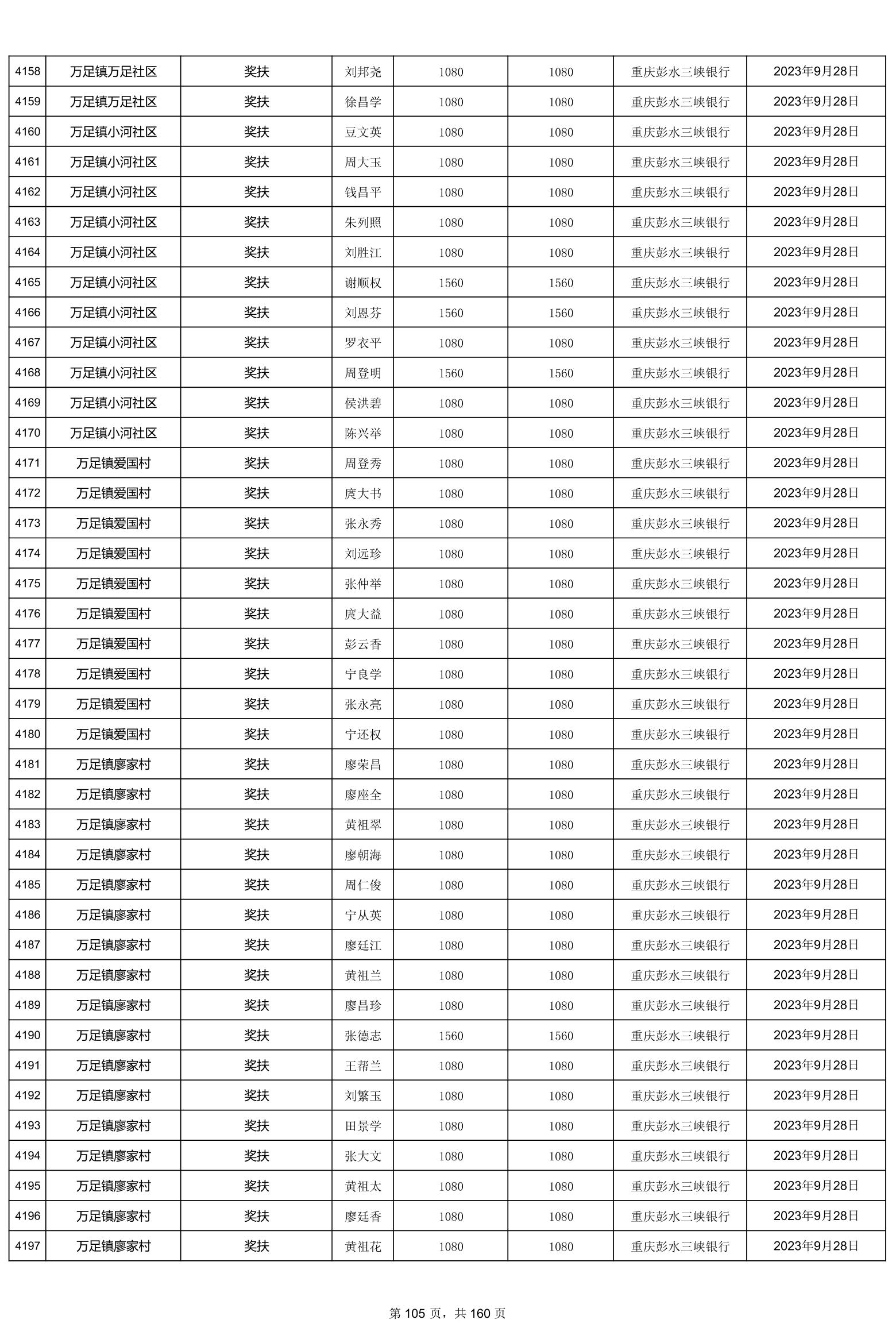 重庆市彭水自治县2023计划生育奖(特)扶扶助金发放明细公示