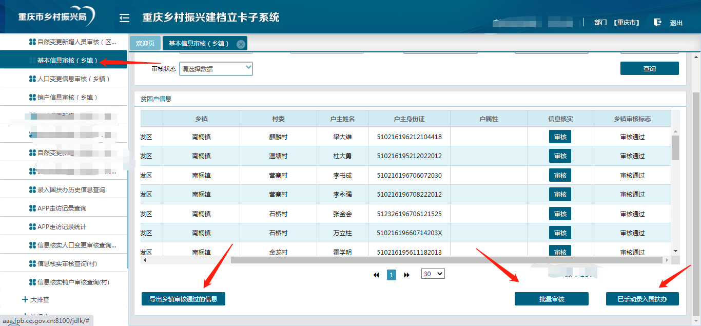- 乡审核:建档立卡子系统—信息核实—基本信息审核(乡镇),点击审核进行审核,也可批量审核及导出;如图11所示
