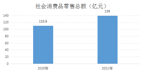 商贸服务业繁荣发展。预计实现社会消费品零售总额139亿元,同比增长26%(图4)。组织110家经营主体开展营销推介活动15场,线上线下累计销售我县农特产品达7000万元。全县31家企业与都市区98个单位签订购销合同,形成长期、稳定的消费合作关系。金融服务实体企业有力有效,金融机构存贷款余额523.8亿元,增长8%。大力发展电子商务,实现电子商务交易额50亿元,网络零售20.1亿元。接待各类游客2300万人次,实现旅游综合收入116亿元。